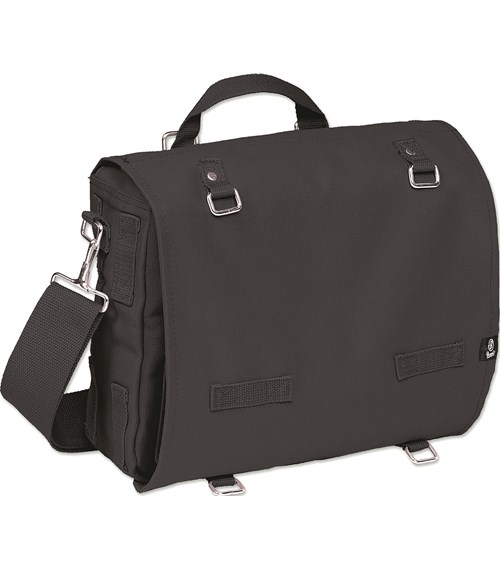 Víko tašky kryje celou přední stěnu a zavírá se dvěma popruhy s průvlekovými sponami
